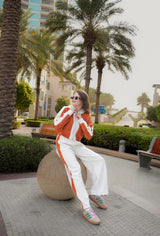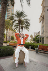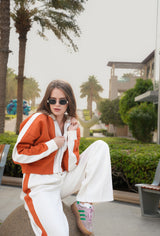 Brighten your wardrobe with the Urban Sunset Co-ord Set, a chic and comfortable ensemble inspired by vibrant cityscapes and warm tones. Featuring a cropped, button-up cardigan in a striking burnt orange and relaxed-fit joggers in clean white with matching accents, this set combines effortless style with premium comfort. Whether you’re out exploring or lounging in style, this versatile co-ord will have you turning heads.