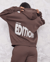 Step into ultimate comfort and style with the Limited Editions Co-ord Set. This oversized hoodie and straight-leg sweatpants combo is crafted from premium cotton for a soft, cozy feel that’s perfect for lounging or casual outings. The bold “Limited Editions” graphic adds a trendy edge to its minimalist design, making it a statement piece for your wardrobe. With a relaxed fit and versatile chocolate-brown tone, this set offers effortless cool for any occasion.